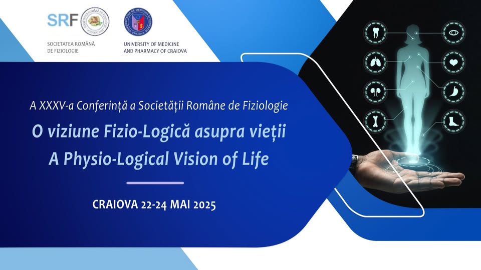 În inima Olteniei, tărâm al spiritului neîmblânzit, unde tradiția se împletește cu inovația, avem deosebita bucurie de a vă invita la cea de-a XXXV-a Conferință a Societății Române de Fiziologie „O viziune Fizio-Logică asupra vieții / A Physio-Logical Vision of Life”, organizată la Craiova, între 22-24 mai 2025.