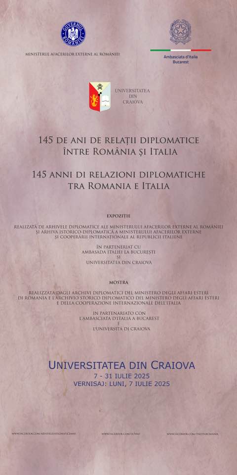 Universitatea din Craiova, în parteneriat cu Ministerul Afacerilor Externe al României și Ambasada Italiei la București, vernisează luni, 7 iulie 2025, ora 15:00, expoziția „145 de ani de relații diplomatice între România și Italia”, în prezența Ambasadorului Italiei în România, E.S. Alfredo Durante Mangoni și a rectorului Universității din Craiova, prof. univ. dr. Cezar Ionuț Spînu.