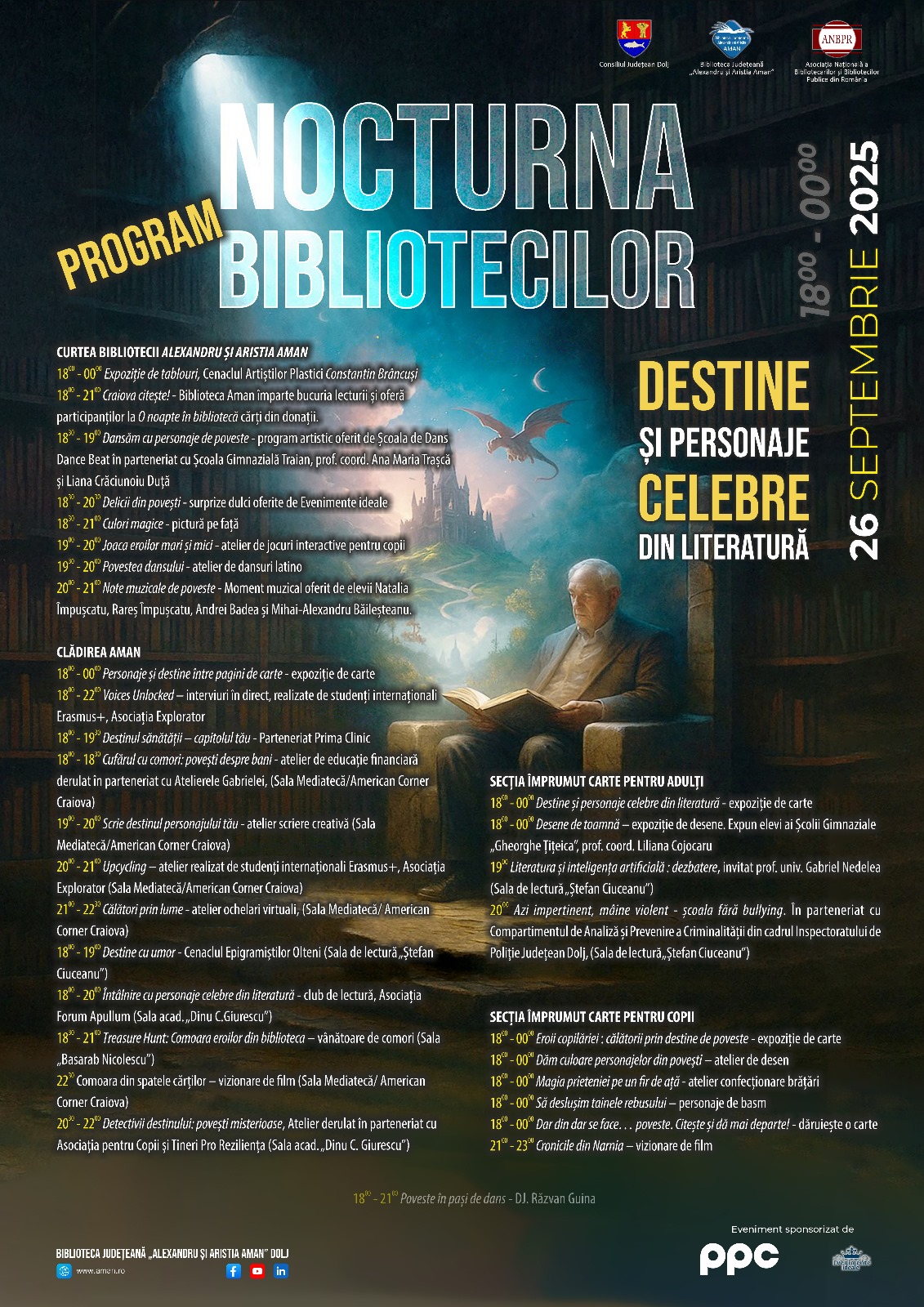 Evenimentul „Nocturna bibliotecilor 2025 – O noapte în bibliotecă” este  sponsorizat de PPC România și Evenimente ideale,  parteneri ai Bibliotecii Judetene „Alexandru și Aristia Aman”.