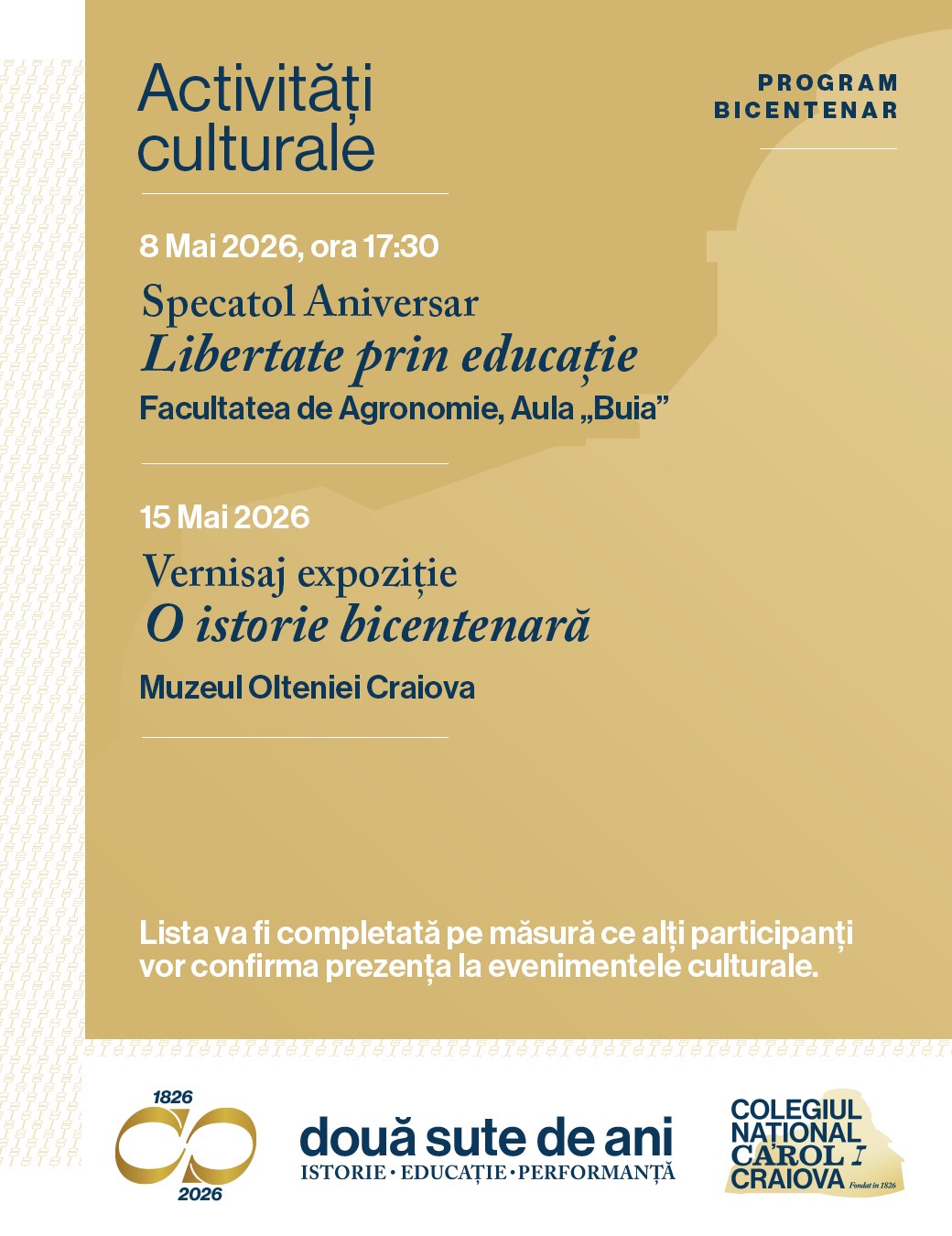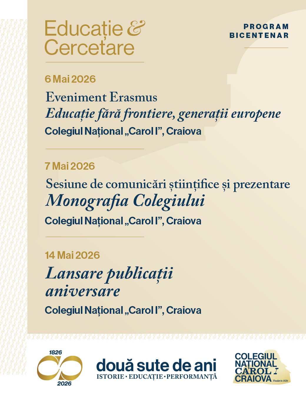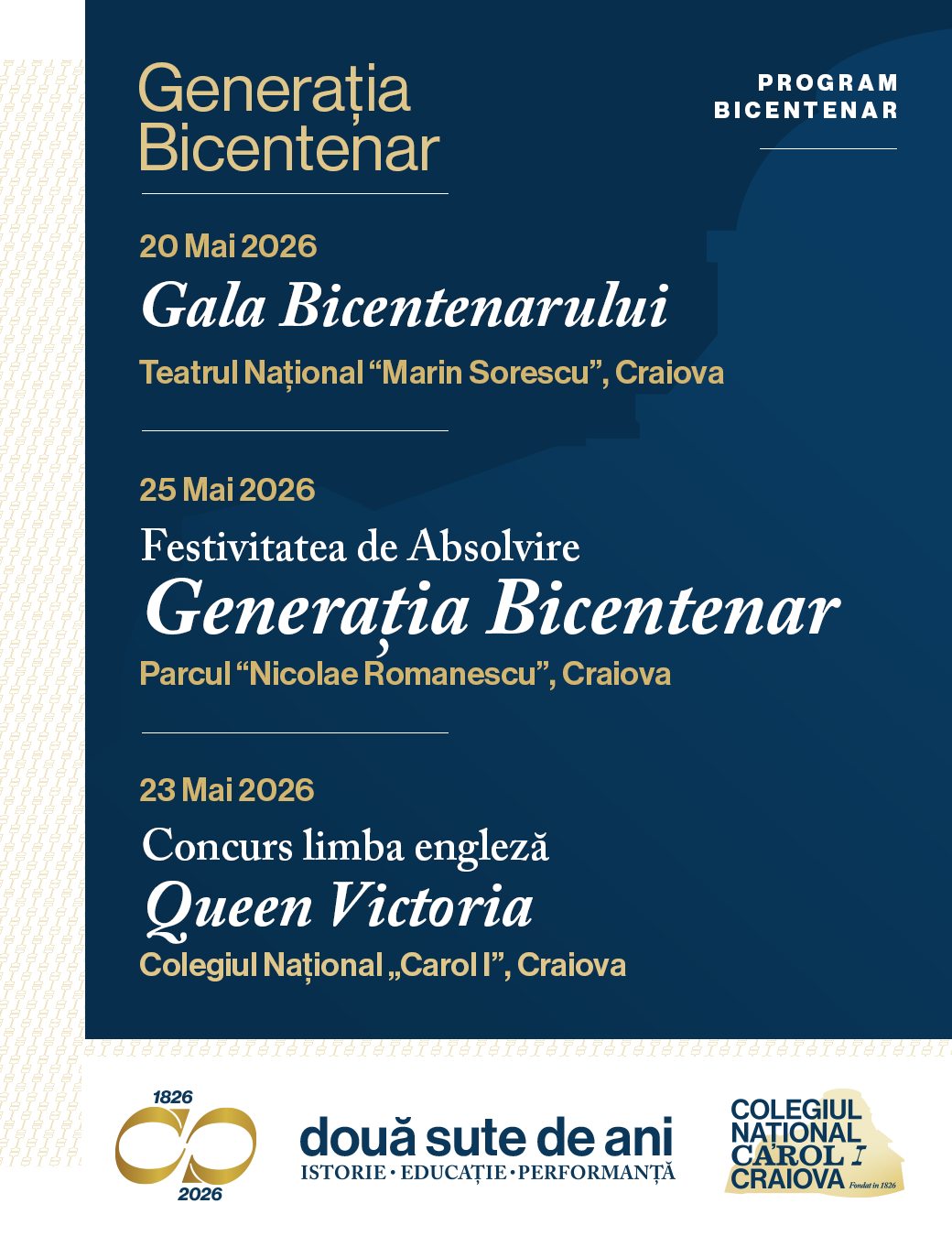Îi invităm pe toți absolvenții, profesorii și partenerii instituției să fie parte din manifestările dedicate acestui moment aniversar, desfășurate în perioada martie–mai 2026, cu punctul culminant în 20 mai — festivitatea oficială a bicentenarului.
