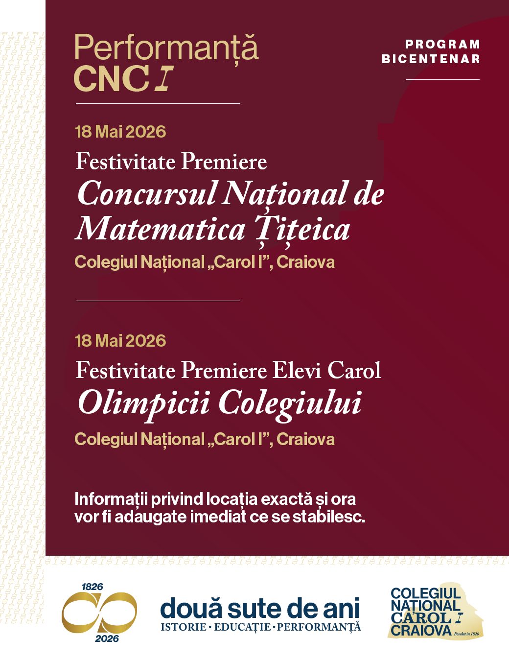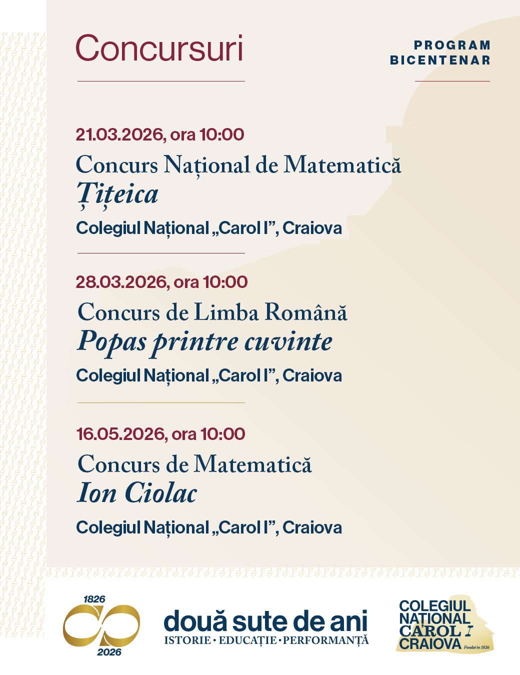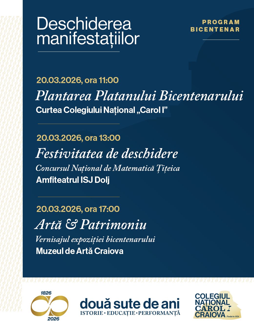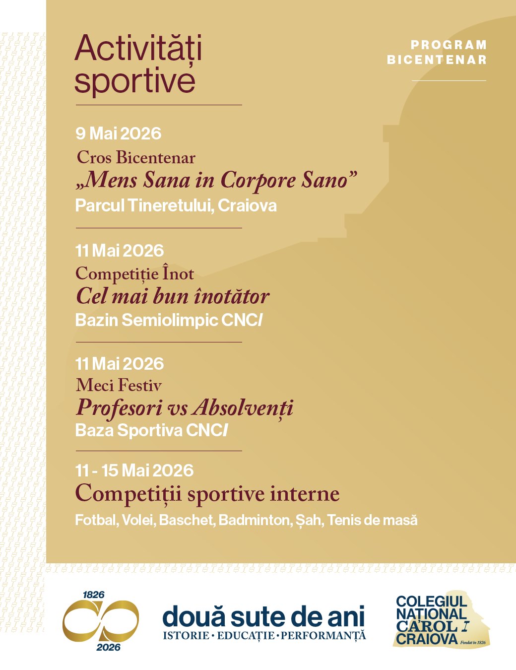 Îi invităm pe toți absolvenții, profesorii și partenerii instituției să fie parte din manifestările dedicate acestui moment aniversar, desfășurate în perioada martie–mai 2026, cu punctul culminant în 20 mai — festivitatea oficială a bicentenarului.