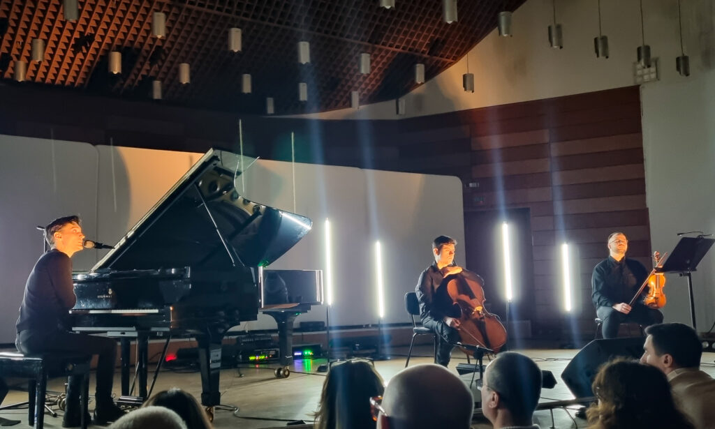 Andrei Irimia, magician al pianului 🎹, a construit un peisaj sonor ce a îmbinat muzica neoclasică cu vibrația subtilă a naturii. Fiecare notă a purtat ecoul ploii, foșnetul pădurii sau cântecul păsărilor, într-un stil care amintește pe alocuri de muzica lui Havasi – dar cu o sensibilitate aparte și un stil personal. Alături de el, violonistul Răzvan Păun și violoncelistul Thibault Solorzano au țesut armonii care au plutit în aerul compact al sălii pline până la refuz, s-au agățat de tavan, s-au prăbușit pe podea și au renăscut în inimile spectatorilor!