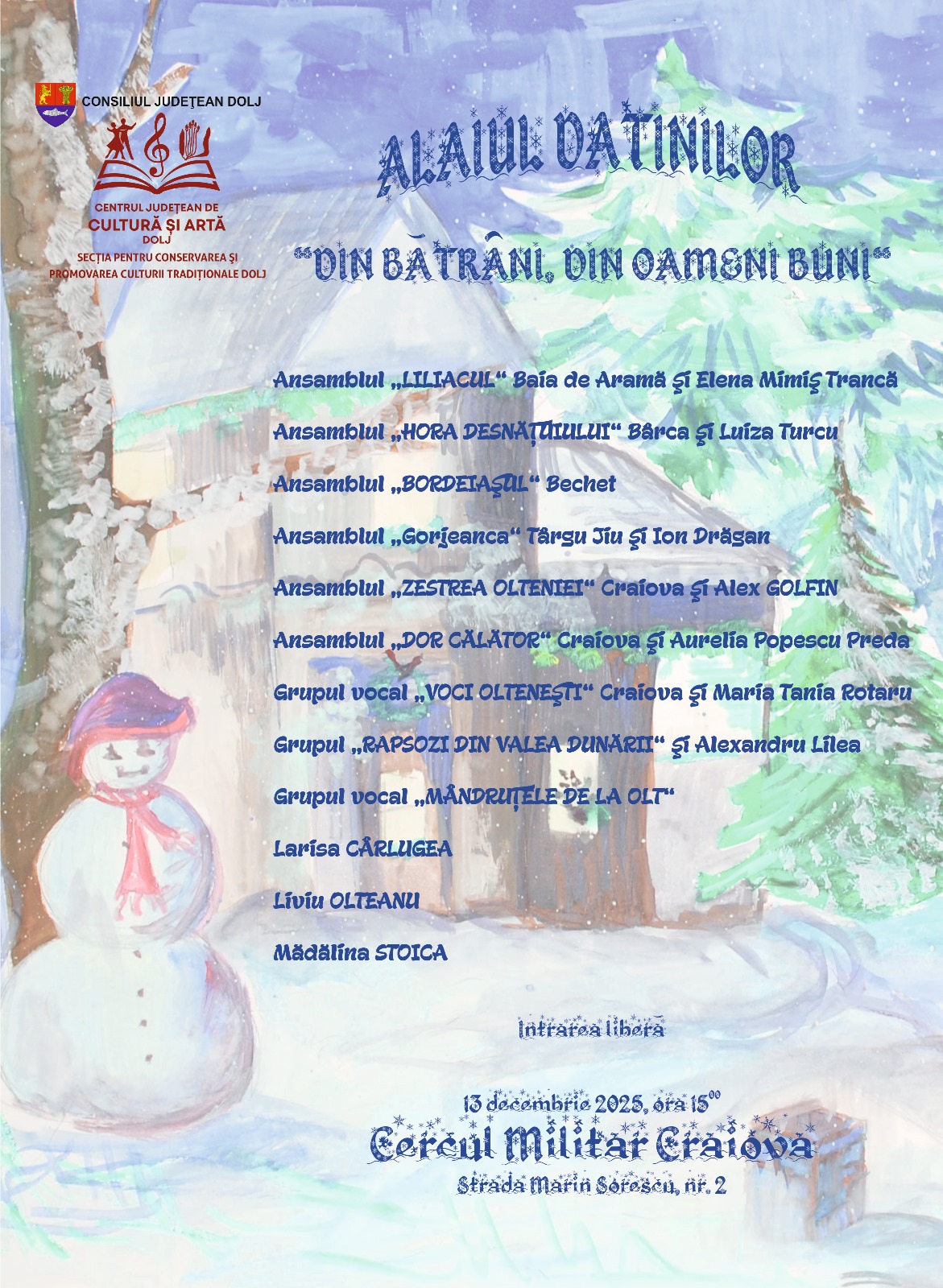 Cercul Militar Craiova Str. Marin Sorescu, nr. 2, Craiova, Dolj, România𝑰𝑵𝑽𝑰𝑻𝑨𝑻̦𝑰𝑬 𝑳𝑨 𝑺𝑷𝑬𝑪𝑻𝑨𝑪𝑶𝑳 𝑬𝑿𝑻𝑹𝑨𝑶𝑹𝑫𝑰𝑵𝑨𝑹 𝑫𝒊𝒏 𝒊𝒏𝒊𝒎𝒂 𝑶𝒍𝒕𝒆𝒏𝒊𝒆𝒊, 𝒑𝒆𝒏𝒕𝒓𝒖 𝒕𝒐𝒕̦𝒊 𝒓𝒐𝒎𝒂̂𝒏𝒊 Iubitorii cântecului românesc sunt invitați cu drag la un spectacol de suflet, dedicat tradiției, emoției și cântecului popular autentic, unde 𝒕𝒓𝒆𝒊 𝒈𝒆𝒏𝒆𝒓𝒂𝒕̦𝒊𝒊 𝒔𝒆 𝒗𝒐𝒓 𝒖𝒏𝒊 𝒊̂𝒏𝒕𝒓-𝒖𝒏 𝒔𝒊𝒏𝒈𝒖𝒓 𝒈𝒍𝒂𝒔. 𝑴𝒊𝒆𝒓𝒄𝒖𝒓𝒊, 4 𝒎𝒂𝒓𝒕𝒊𝒆 2026 𝑶𝒓𝒂 18:00 𝑪𝒆𝒓𝒄𝒖𝒍 𝑴𝒊𝒍𝒊𝒕𝒂𝒓 – 𝑪𝒓𝒂𝒊𝒐𝒗𝒂 Pe scenă, alături de Filuța Bogdan, vor urca artiști...