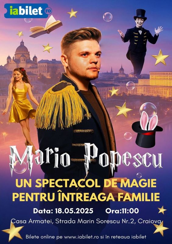 Cercul Militar Craiova Str. Marin Sorescu, nr. 2, Craiova, Dolj, RomâniaȘoriceii Bucătari Spectacol muzical cu mascote, personaje și păpuși VINERI 10 Noiembrie 2025 ora 17:30 Casa Armatei (Cercul Militar) Craiova Acum ai ocazia să îți întâlnești pe cei mai faimosi șoricei,personajele favorite ale copiilor ,în cadrul celui mai distractiv spectacol pentru copii. Șoriceii știu cât de important este micul dejun pentru a avea energie întreaga zi, așa...