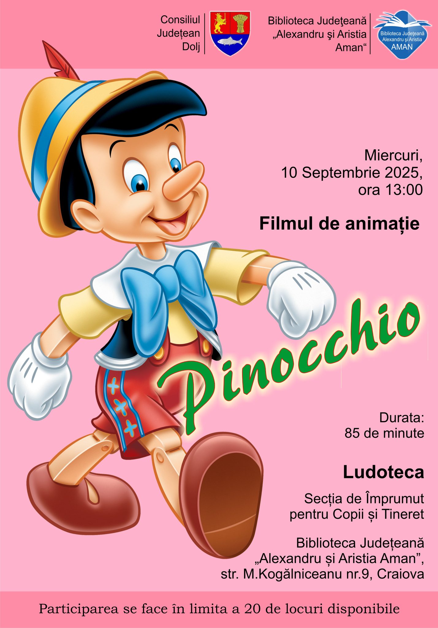 Biblioteca Județeană Alexandru și Aristia Aman Str. M. Kogălniceanu, nr. 9, Craiova, Dolj, România𝑰𝒏𝒗𝒊𝒕𝒂𝒕̦𝒊𝒆 𝒍𝒂 𝒇𝒊𝒍𝒎 𝒑𝒆𝒏𝒕𝒓𝒖 𝒄𝒆𝒊 𝒎𝒊𝒄𝒊! Secția de Împrumut pentru Copii și Tineret – Ludotecă Miercuri, 10 septembrie 𝑶𝒓𝒂 13:00 – 14:30 Vă așteptăm cu drag la vizionarea filmului clasic de animație „Pinocchio” Categoria: Animație Durata: 85 min Locuri disponibile: doar 20 (participarea se face în limita locurilor disponibile) Povestea celebrului băiețel din lemn prinde...