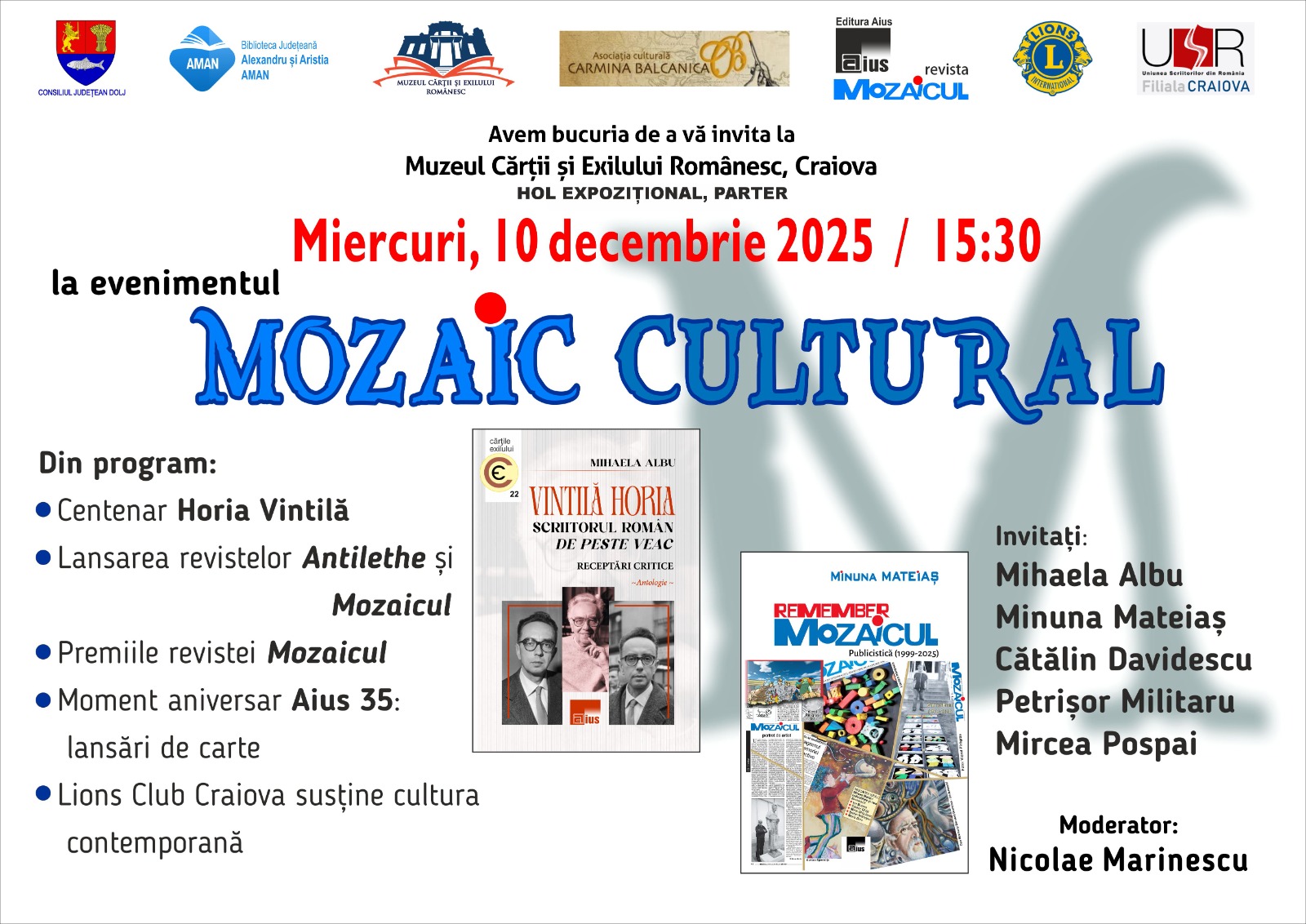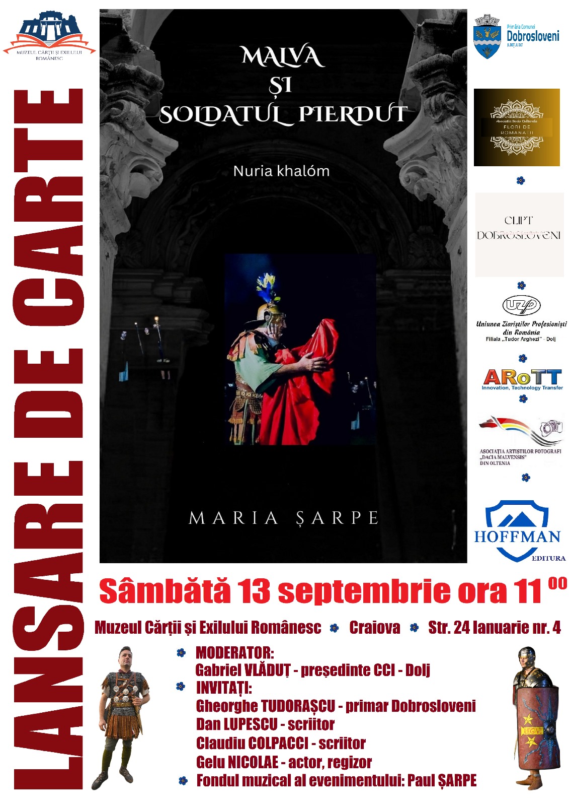 Muzeul Cărții și Exilului Românesc Str. 24 Ianuarie nr. 4, Craiova, Dolj, RomâniaMuzeul Cărții și Exilului Românesc găzduiește sâmbătă, 13 septembrie 2025, începând cu ora 11.00, lansarea volumului Malva și soldatul pierdut, semnat de Maria Șarpe. Evenimentul va fi moderat de Gabriel Vlăduț, președinte al Camerei de Comerț și Industrie Dolj. Alături de autoare, la lansarea volumului Malva și soldatul pierdut se vor afla invitații: Gheorghe Tudorașcu,...