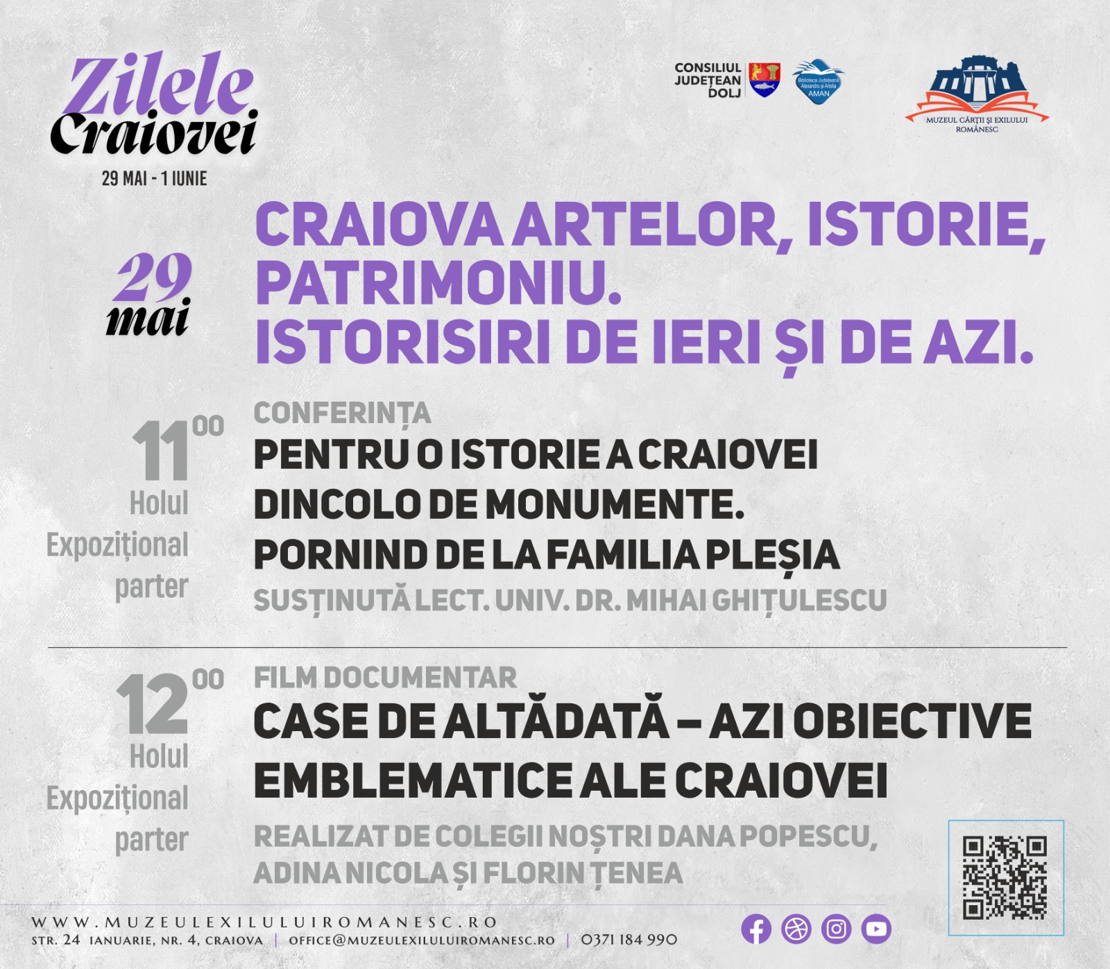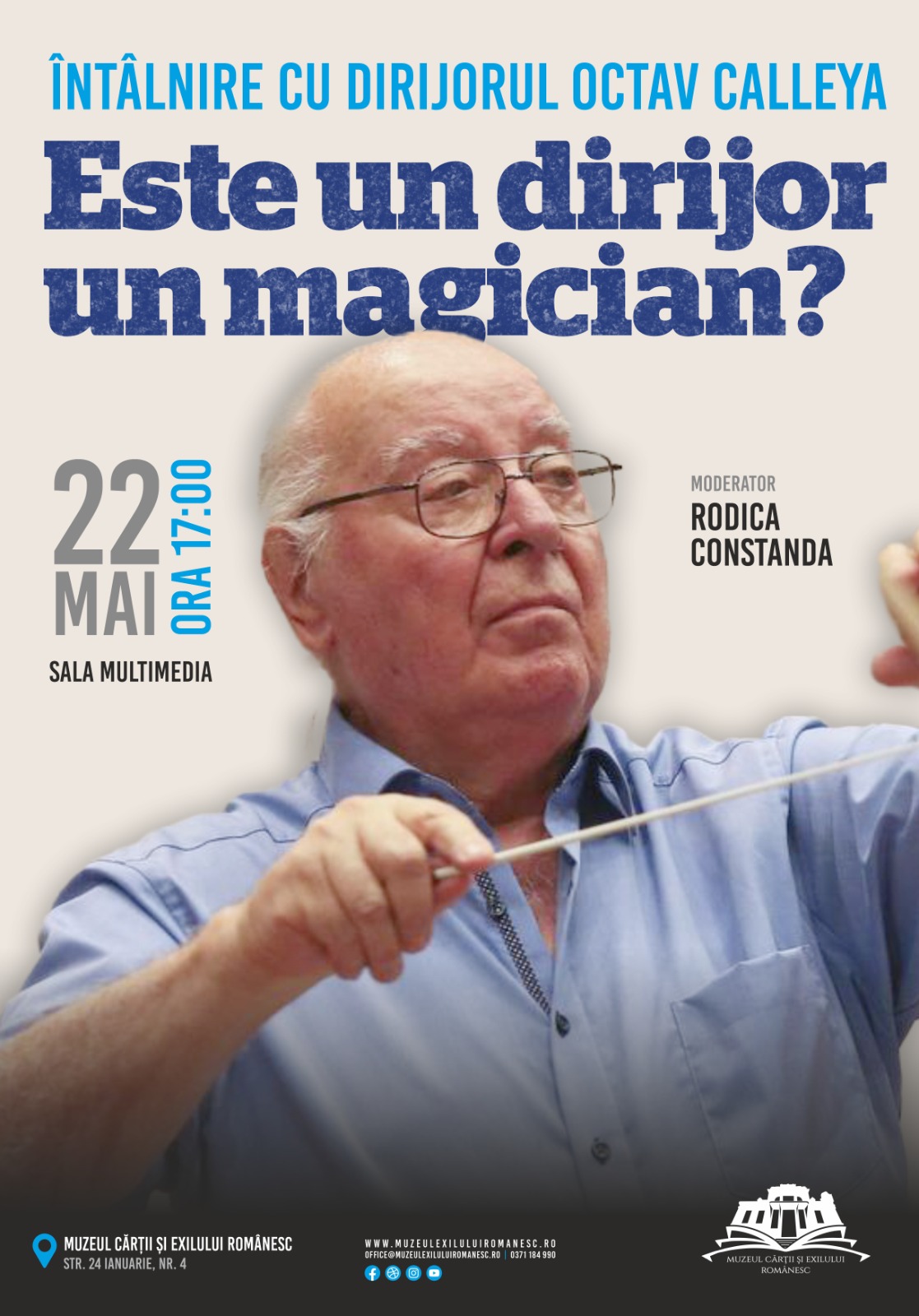 Muzeul Cărții și Exilului Românesc Str. 24 Ianuarie nr. 4, Craiova, Dolj, RomâniaMuzeul Cărții și Exilului Românesc organizează joi, 22 mai 2025, începând cu ora 17:00, în sala Multimedia, conferința „Întâlnire cu dirijorul Octav Calleya. Este un dirijor un magician?”, susținută de celebrul dirijor Octav Calleya. Evenimentul va include vizionarea unor momente muzicale, alese cu grijă de către maestrul Octav Calleya, momente care vor puncta demonstrația teoretică....